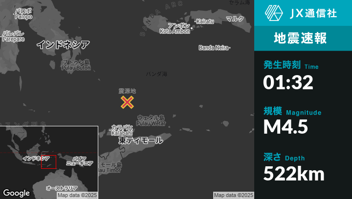 8月13日 01:32頃、東ティモールのDiliから北192kmの地点でM4.5の地震がありました。