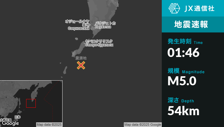 8月15日 01:46頃、ロシアのSevero-Kuril’skから南104kmの地点でM5.0の地震がありました。