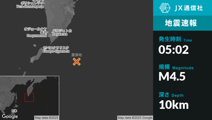 8月15日 05:02頃、ロシアのSevero-Kuril’skから東南東190kmの地点でM4.5の地震がありました。
