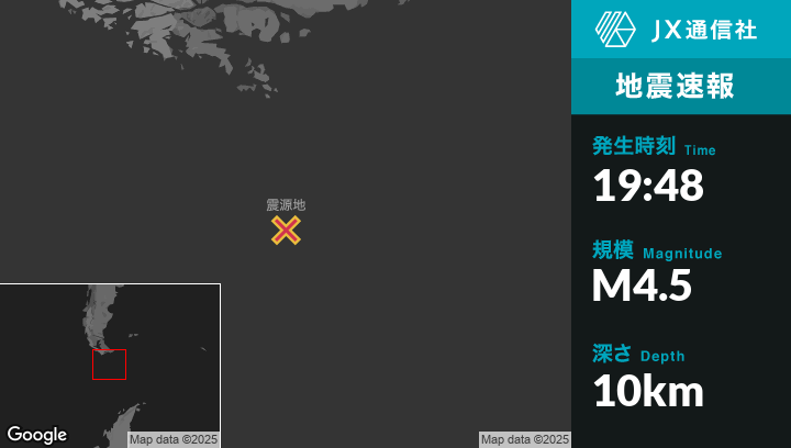 8月17日 19:48頃、アルゼンチンのUshuaiaから南南東295kmの地点でM4.5の地震がありました。