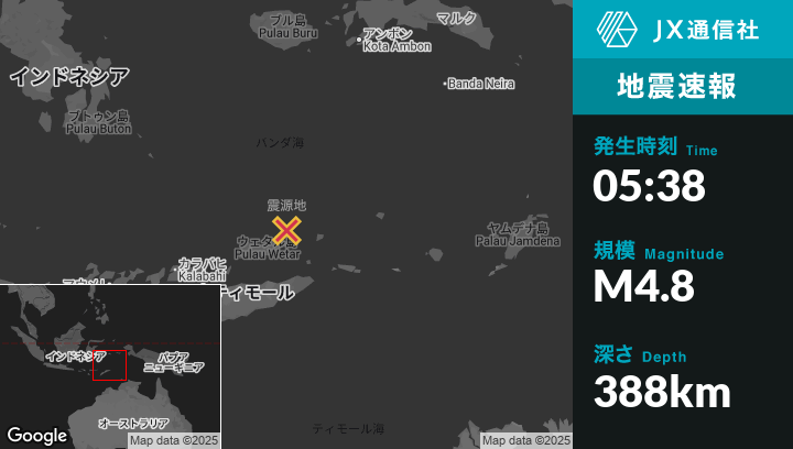 8月19日 05:38頃、東ティモールのBaukauから北北東132kmの地点でM4.8の地震がありました。