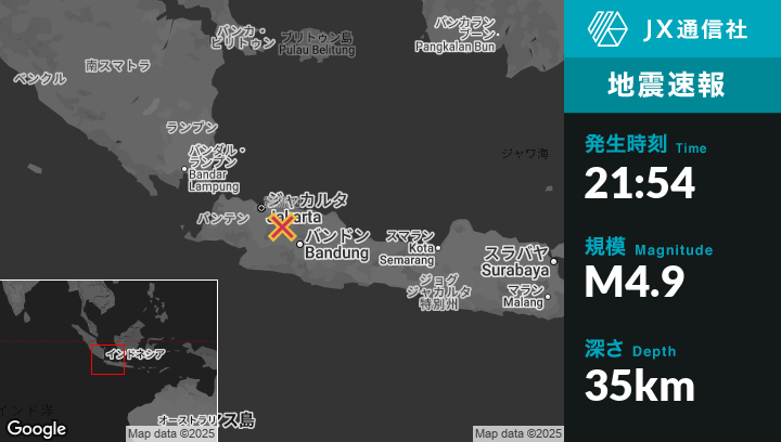 8月20日 21:54頃、インドネシアのCikarangから南南東23kmの地点でM4.9の地震がありました。