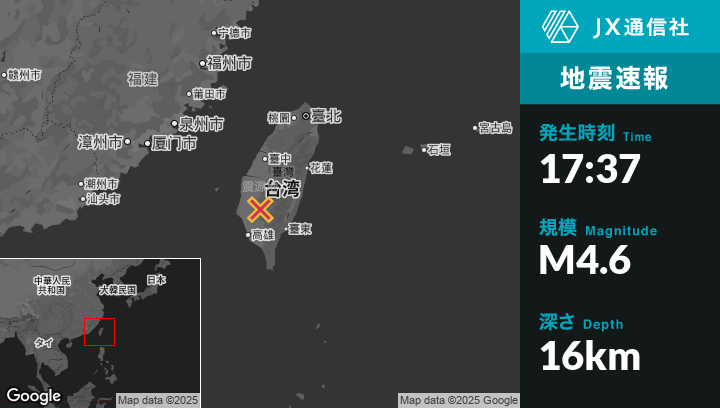 8月21日 17:37頃、台湾のYujingから北北東17kmの地点でM4.6の地震がありました。
