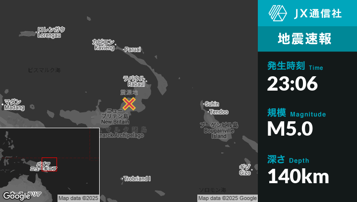 | 震源地 | パプアニューギニアのKokopoから南西124kmの地点 |