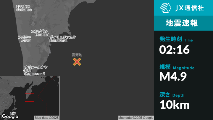 8月22日 02:16頃、ロシアのPetropavlovsk-Kamchatskyから南東175kmの地点でM4.9の地震がありました。