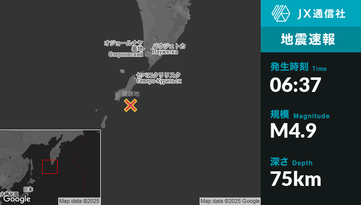 8月22日 06:37頃、ロシアのSevero-Kuril’skから南南西77kmの地点でM4.9の地震がありました。