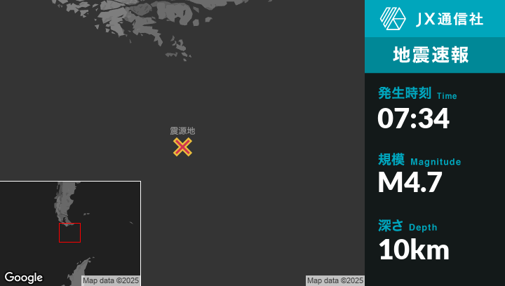 8月22日 07:34頃、アルゼンチンのUshuaiaから南南東290kmの地点でM4.7の地震がありました。