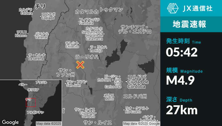 | 震源地 | アルゼンチンのSan Agustín de Valle Fértilから北39kmの地点 |