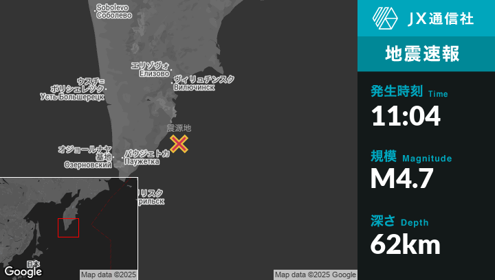 8月24日 11:04頃、ロシアのVilyuchinskから南124kmの地点でM4.7の地震がありました。