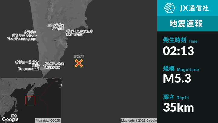 9月23日 02:13頃、ロシアのVilyuchinskから南南東156kmの地点でM5.3の地震がありました。