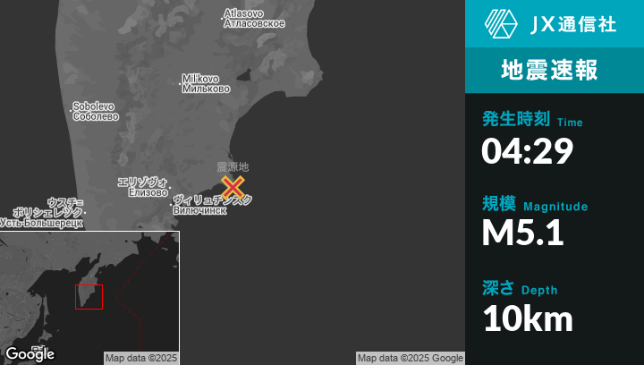 | 震源地 | ロシアのPetropavlovsk-Kamchatskyから東北東89kmの地点 |