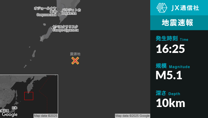 9月27日 16:25頃、ロシアのSevero-Kuril’skから南東208kmの地点でM5.1の地震がありました。