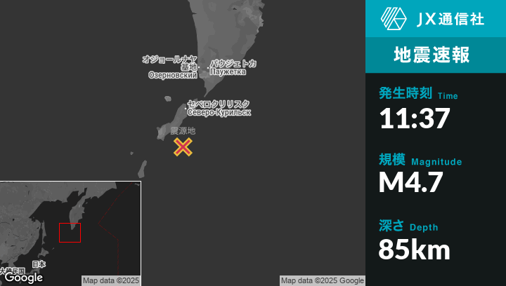 | 震源地 | ロシアのSevero-Kuril’skから南78kmの地点 |