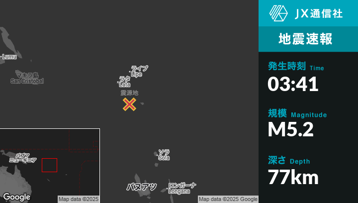 | 震源地 | ソロモン諸島のLataから南南東107kmの地点 |