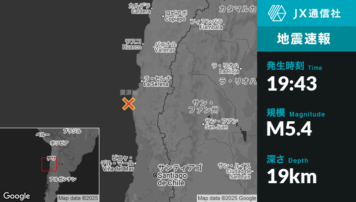 10月02日 19:43頃、チリのOvalleから西62kmの地点でM5.4の地震がありました。