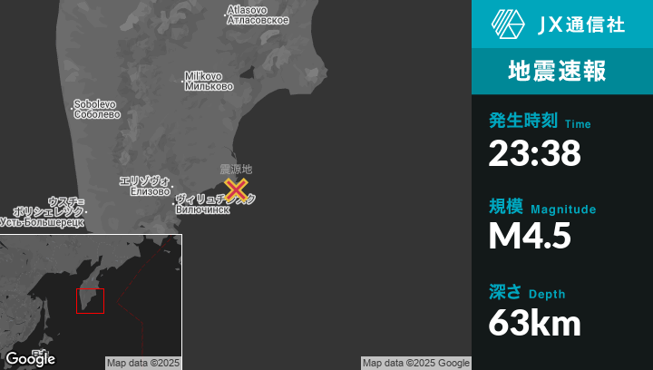 | 震源地 | ロシアのPetropavlovsk-Kamchatskyから東87kmの地点 |