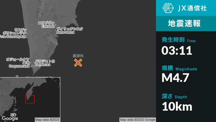 10月03日 03:11頃、ロシアのVilyuchinskから南東188kmの地点でM4.7の地震がありました。