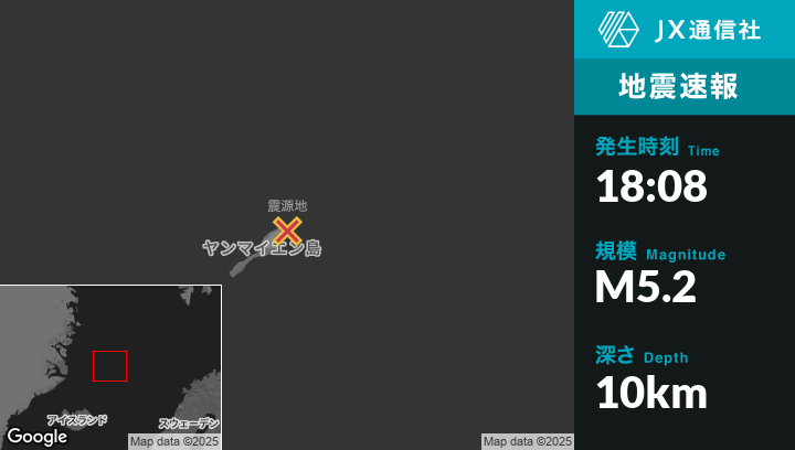 10月05日 18:08頃、スヴァールバル諸島とヤンマイエン島のOlonkinbyenから北東40kmの地点でM5.2の地震がありました。