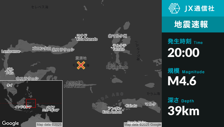 | 震源地 | インドネシアのModisiから南東124kmの地点 |