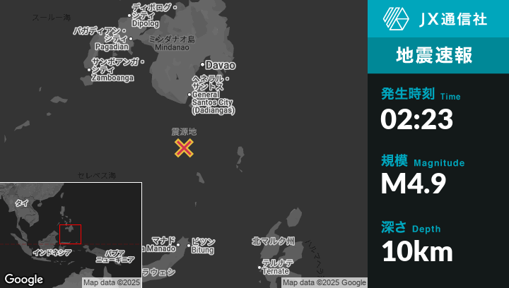 10月06日 02:23頃、フィリピンのSaranganiから南南西101kmの地点でM4.9の地震がありました。