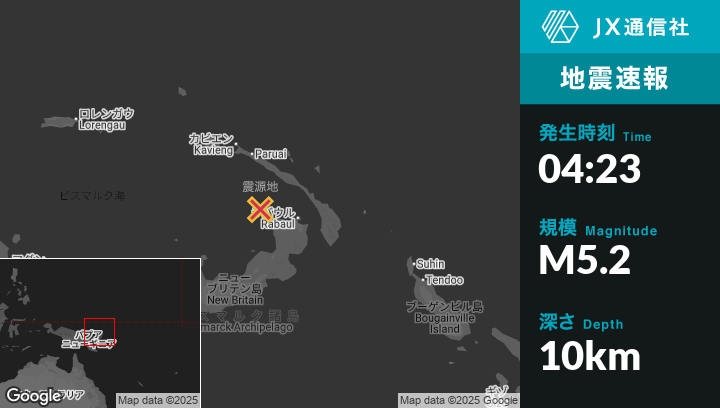 10月06日 04:23頃、パプアニューギニアのRabaulから西北西98kmの地点でM5.2の地震がありました。