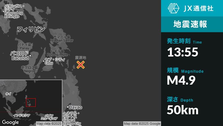 10月07日 13:55頃、フィリピンのSanta Monicaから東北東55kmの地点でM4.9の地震がありました。
