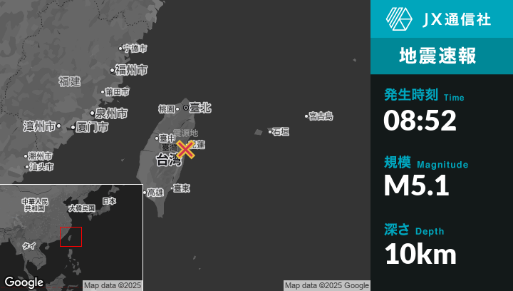 10月08日 08:52頃、台湾のHualien Cityから西南西4kmの地点でM5.1の地震がありました。