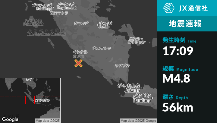 | 震源地 | インドネシアのBengkuluから南50kmの地点 |