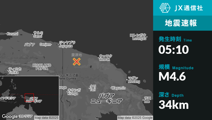 10月10日 05:10頃、パプアニューギニアのAitapeから南南西76kmの地点でM4.6の地震がありました。