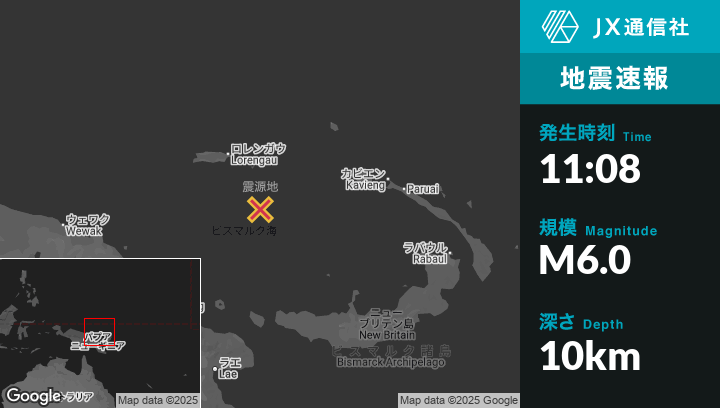 10月10日 11:08頃、パプアニューギニアのLorengauから南南東144kmの地点でM6.0の地震がありました。