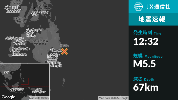 10月10日 12:32頃、フィリピンのManayから東南東35kmの地点でM5.5の地震がありました。
