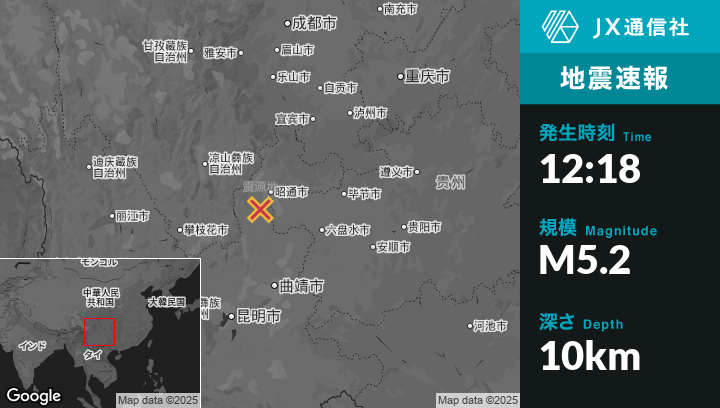 10月11日 12:18頃、中国のZhaotongから南西34kmの地点でM5.2の地震がありました。