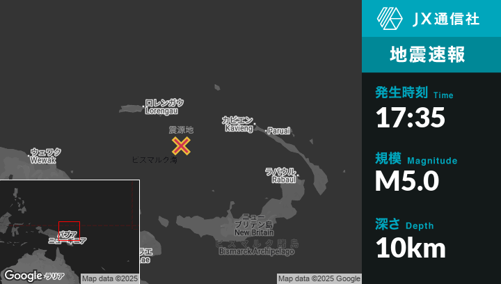 | 震源地 | パプアニューギニアのLorengauから南東181kmの地点 |