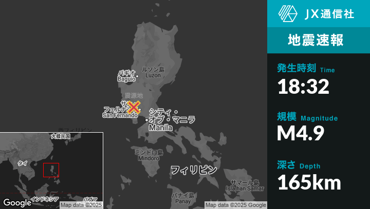 10月11日 18:32頃、フィリピンのSanta Julianaから南10kmの地点でM4.9の地震がありました。