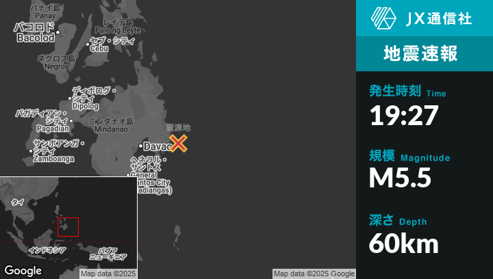 10月11日 19:27頃、フィリピンのSantiagoから東24kmの地点でM5.5の地震がありました。
