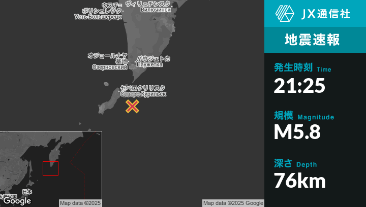 10月11日 21:25頃、ロシアのSevero-Kuril’skから南東56kmの地点でM5.8の地震がありました。