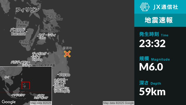 10月11日 23:32頃、フィリピンのAras-asanから東北東10kmの地点でM6.0の地震がありました。