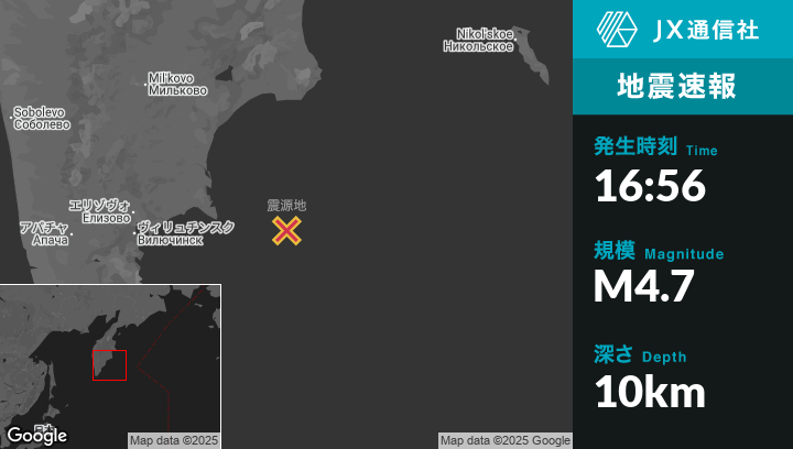 10月12日 16:56頃、ロシアのPetropavlovsk-Kamchatskyから東187kmの地点でM4.7の地震がありました。