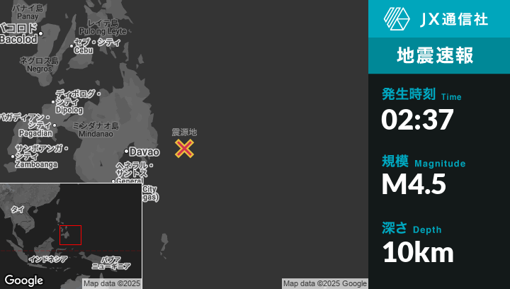 10月13日 02:37頃、フィリピンのSantiagoから東91kmの地点でM4.5の地震がありました。