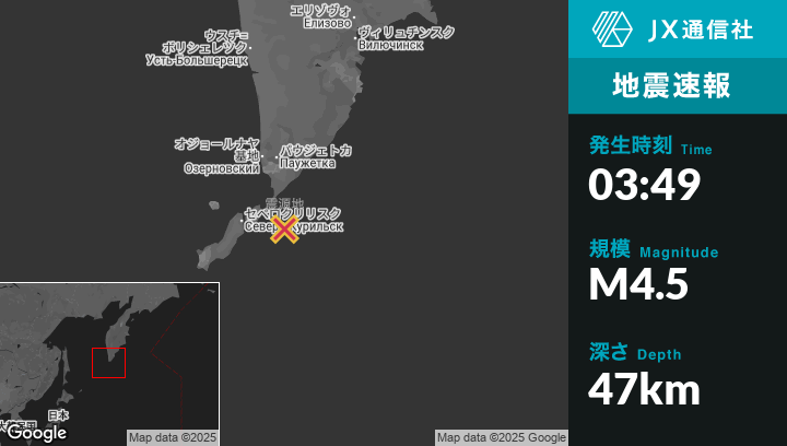10月14日 03:49頃、ロシアのSevero-Kuril’skから東59kmの地点でM4.5の地震がありました。