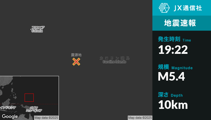 10月15日 19:22頃、ミクロネシアのFaisから南南東299kmの地点でM5.4の地震がありました。