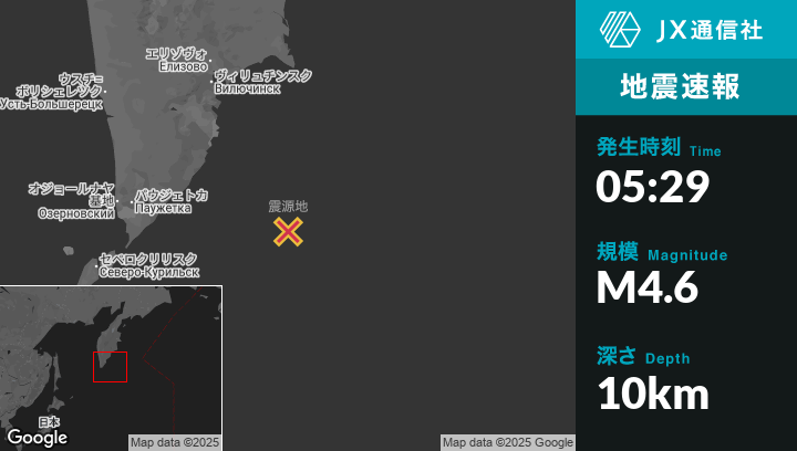 10月17日 05:29頃、ロシアのVilyuchinskから南南東221kmの地点でM4.6の地震がありました。