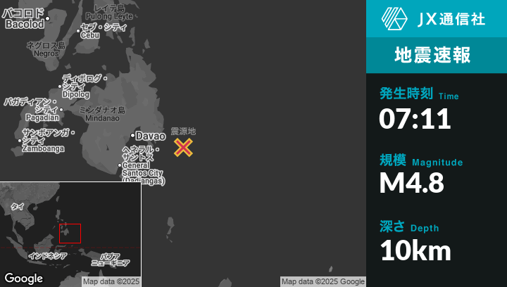 10月17日 07:11頃、フィリピンのManayから東南東82kmの地点でM4.8の地震がありました。