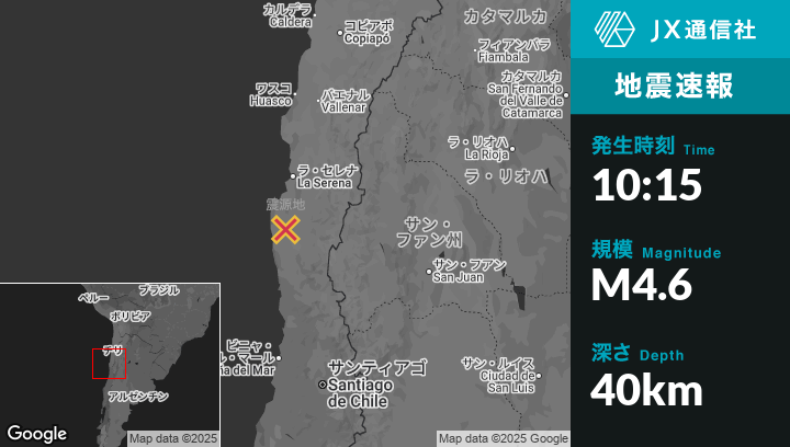 10月17日 10:15頃、チリのOvalleから西南西23kmの地点でM4.6の地震がありました。