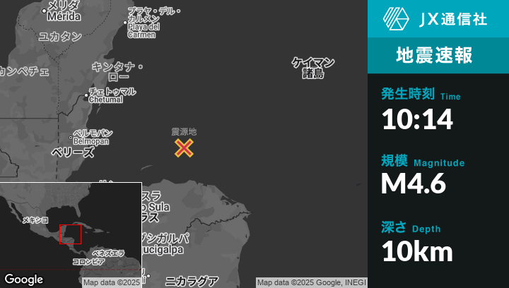 10月17日 10:14頃、ホンジュラスのSavannah Bightから北東92kmの地点でM4.6の地震がありました。