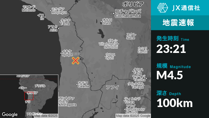 10月18日 23:21頃、チリのLa Tiranaから東南東73kmの地点でM4.5の地震がありました。