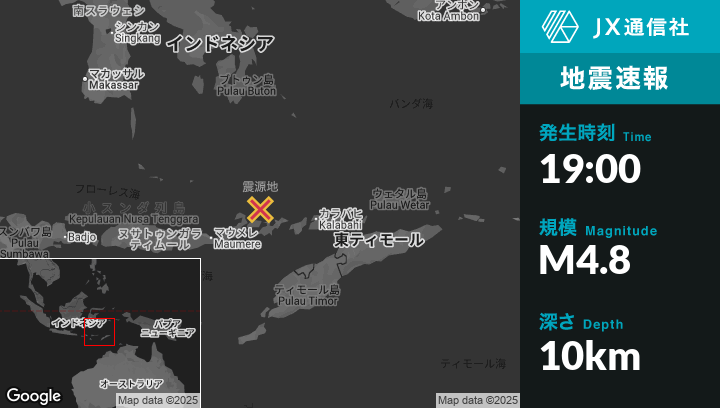 10月19日 19:00頃、インドネシアのMaumereから北東143kmの地点でM4.8の地震がありました。