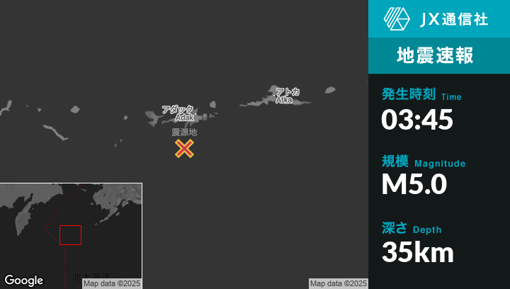 10月21日 03:45頃、アラスカのAdakから南南西71kmの地点でM5.0の地震がありました。