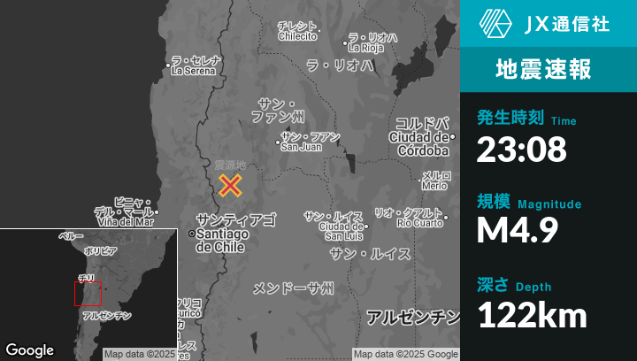 10月21日 23:08頃、チリのLos Andesから東北東98kmの地点でM4.9の地震がありました。