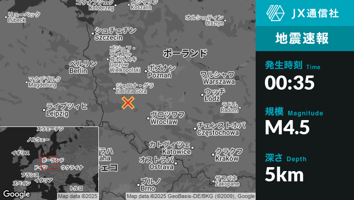 10月22日 00:35頃、ポーランドのGrębociceから北西3kmの地点でM4.5の地震がありました。